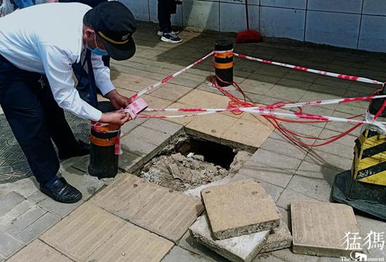 5月11日上午10時許,鄭州市緯五路東明路交叉西約50米路北人行道,一處盲道轉彎處的地磚下發生塌陷。幾名途經此處的豐產路巡防員找來棍子向下試探發現,盲道下塌陷約有1.5米深。