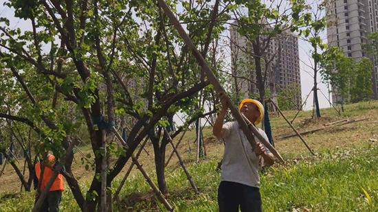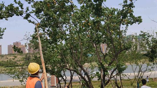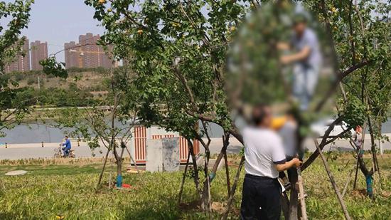 男子離開不久,正當(dāng)幾名護(hù)林員按照指示,忙著用木棍敲打樹上的杏果時,緊接著又趕來一名廊道管理人員,當(dāng)即對敲打杏樹進(jìn)行制止。并稱,不能這么敲打果樹,這樣前來拾杏的人多了,會把地上新栽的花草踩壞,男子隨后一陣叮囑后,轉(zhuǎn)身離開。