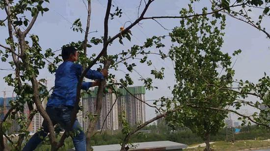 當(dāng)日上午九時許,一位廊道管理方負(fù)責(zé)人騎車趕到杏林,一邊大聲的制止采摘杏果的游客,一邊指示附近兩名廊道護(hù)林員,拿木棍把樹的杏都給打下來。隨后,只見其一邊指揮護(hù)林員用木棍敲打杏果,一邊麻利的爬上一棵杏樹,用雙手緊握樹枝,使勁的搖晃,瞬間樹上的杏果如雨一般紛紛落地。一陣搖樹后,該男子爬下樹來,轉(zhuǎn)身離去,在臨走時,一再指示廊道護(hù)林員,繼續(xù)用木棍敲打杏樹,把將熟的杏都敲下來,避免游客上樹采摘發(fā)生危險。