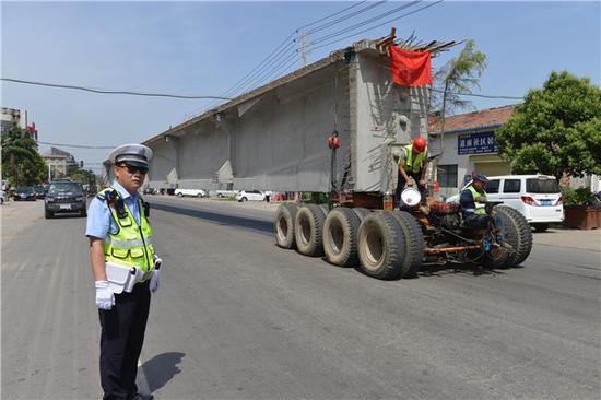 5月22日,一根長50米,重198噸的橋梁從T型橋梁預制廠,運送至新密市X027岳下線龍潭大橋施工地。新密市公安局交警大隊七中隊的民警們在高溫下,沿路護送近4小時,保障了道路的安全和暢通。