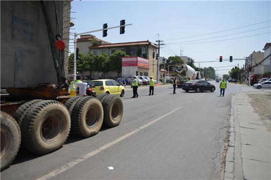 為確保施工正常進行以及沿途2公里的道路安全通暢,新密市公安局交警大隊七中隊民警馬紅偉、周建彬帶領班組人員為該“巨無霸”沿途護送,對車流全力疏導,維護通行秩序。民警們頂著炎炎烈日,冒著35攝氏度的高溫,顧不上彈掉身上飄灑的灰塵、擦掉臉上的汗水,他們從早上8時許開始、一直忙到中午臨近12時,才將這架“巨無霸”護送到施工工地,民警們才顧得上撤回中隊吃飯休息片刻,為下午的第二次護航做準備。