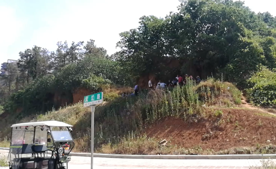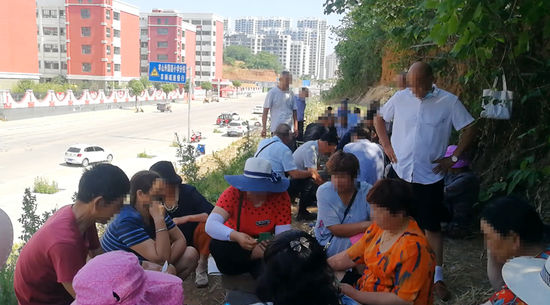 6月4日上午10點,在信陽市羊山外國語小學分校對面(文匯路東側),是一處尚未開發的山體,該山體半山腰上有一片相對平坦的區域。該區域東邊正好也是山體和樹木,能夠遮擋上午的陽光,時不時還有涼風吹過。40多位市民圍著4張桌子,正在打著撲克消磨時間。