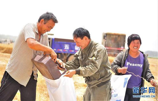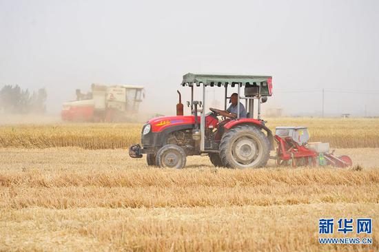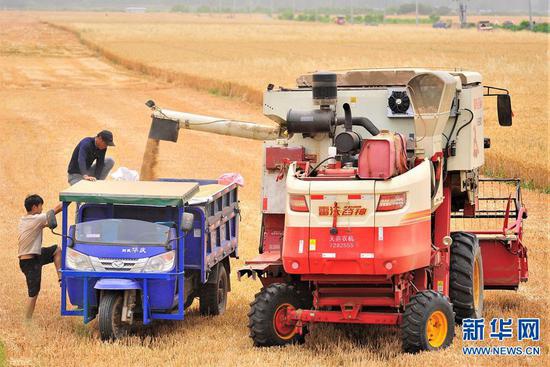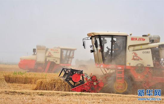 6月2日,在河南省新鄉市原陽縣韓董莊鎮賈莊村的麥田里,收割機正在搶收小麥。當日,河南黃河以北地區麥收進入高峰期,豫北的麥田里,剛剛還是“亭亭玉立”的麥子,隆隆機聲過后,一轉眼就變成了飽滿的麥粒。隨著農業機械的大規模使用,原本搶收搶種的“三夏”越發地簡單、快捷和從容。