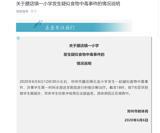 2020年6月6日12時30分左右,鄧州市腰店鎮五龍小學發生一起疑似食物中毒事件,涉事學生第一時間全部送至醫院進行積極診斷治療。截至18時,除7名癥狀輕微學生留觀外,其余學生經醫學檢查后全部返家。具體原因正在調查中。
