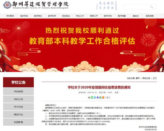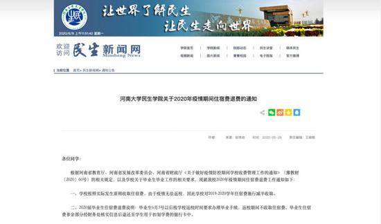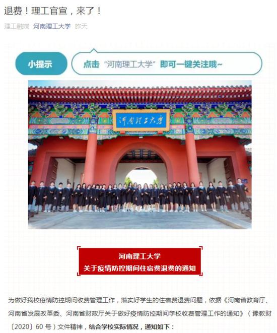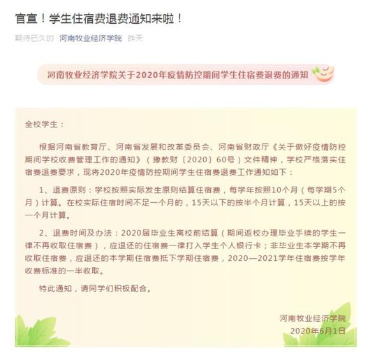 通知中指出各高等學校應嚴格落實住宿費退費要求,截至目前,河南多所高校已經明確了住宿費退費通知。