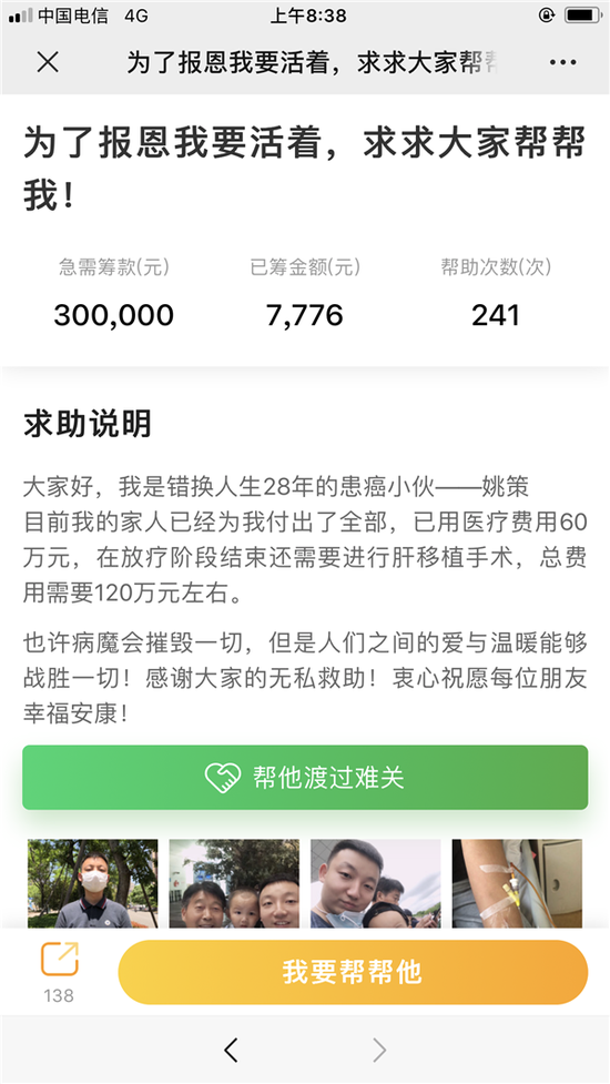 這些來自陌生人的溫暖情意,讓姚策感動之余,更加堅定了面對殘酷現實的信念。他發起了眾籌,目標是30萬,“目前我的家人已經為我付出了全部,已用醫療費用60萬元,在放療階段結束還需要進行肝移植手術,總費用需要120萬元左右。也許病魔會摧毀一切,但是人們之間的愛與溫暖能夠戰勝一切!”