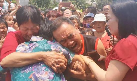 6月8日中午,當“寶貝回家”的志愿者載著張?zhí)鹛鸬热藖淼剿睦霞蚁宄强h山頭店鎮(zhèn)時,她的家人和村里不少鄰居都早早守候在了村口,為了迎接她回來,家里還專門請來了腰鼓隊,當張?zhí)鹛鹣萝嚭笠幌伦颖銖娜巳褐姓J出了自己的父母和姐姐,這一刻一家人已等了17年。