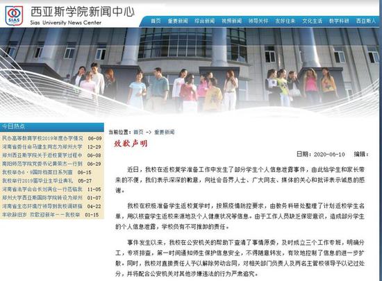 原標題:《鄭州西亞斯學院學生信息泄露 校方:直接責任人解聘》