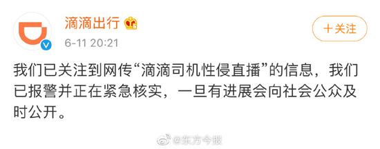 6月11日晚,有網友在社交媒體平臺發文稱,一位自稱“滴滴司機”的男士在路邊搭載女乘客并直播進行性侵。對此,滴滴回應表示,已報警并正在緊急核實,一旦有進展會向社會公眾及時公開。