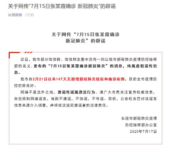 原標題:《[權(quán)威發(fā)布]關(guān)于網(wǎng)傳“7月15日張某霞確診新冠肺炎”的辟謠》