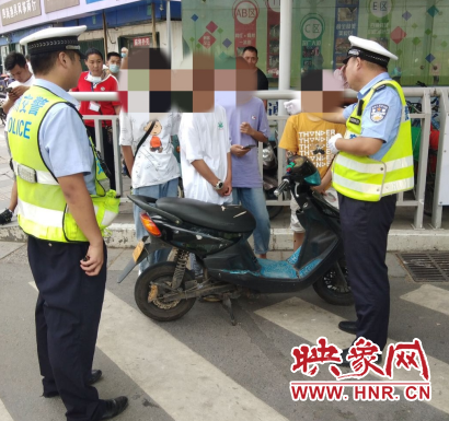 映象網訊(記者 王韶卿 通訊員 楊晨曦)8月13日下午17時20分左右,鄭州交警三大隊車站一中隊中隊長王楊和輔警王帥正在福壽街興隆街路口執(zhí)勤,一輛電動車晃晃悠悠從北邊騎行過來,仔細一看,一輛小小的電動車上擠了四個人,輔警王帥趕忙攔下來。