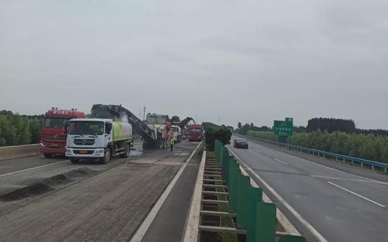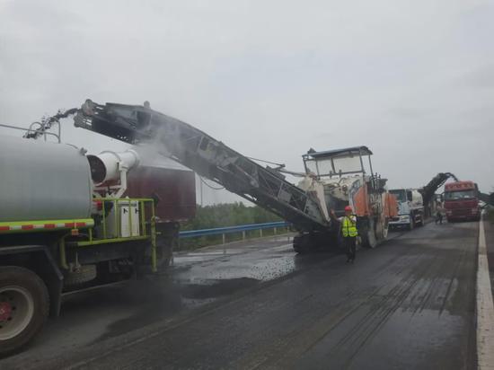 這是目前晉新高速平原新區到京港澳高速之間進行的路面維修施工,總工期12天。銑刨是修復的第一步,簡單來說就是把出現裂紋較重以及破損的路面層清除掉之后, 重新鋪設。