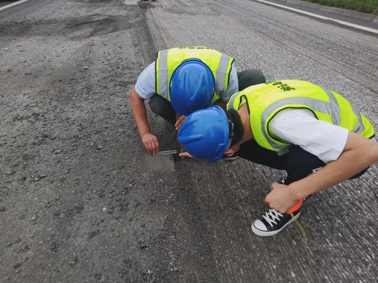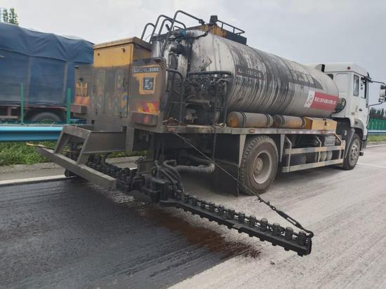 看起來似乎很容易,但整個過程想要完成,需要很多工作人員的協同作業。2020年新鄭管理處路面養護專項二標負責人王晨雨介紹,銑刨將近5厘米的高度,需要人工測量確認,以免有不平整的地方出現。接著對路面進行清掃,對于有裂縫、沉陷、唧漿(地表水滲入基層,使基層軟化、膨脹,在車輛荷載的連續作用下,基層中細小顆粒從面層空隙噴射出來的現象)的地方,需要繼續處理。然后,撒布粘層油。最后才是我們經常能見到的瀝青混合料的回鋪,壓實冷卻之后,就可以美美的跑一個了。