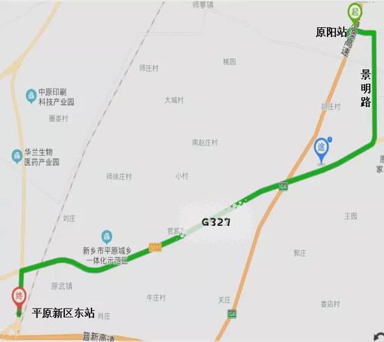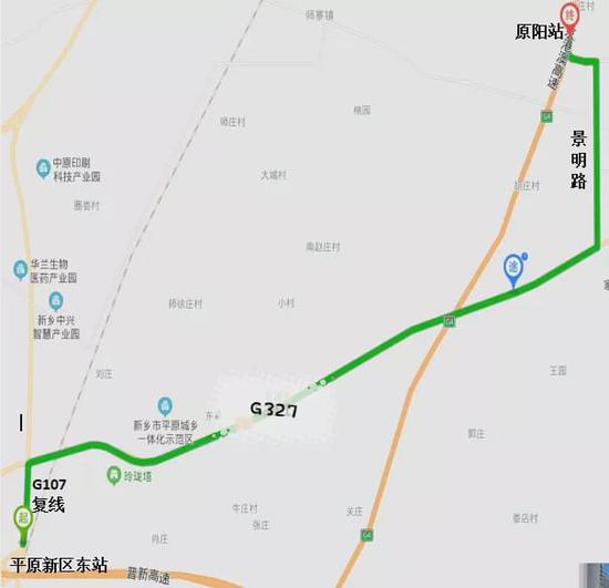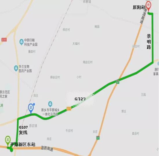 分流點設在原陽站(提前下站),分流路線為京港澳高速——原陽收費站——黃河大道——景明路——G327——G107復線——平原新區東站。