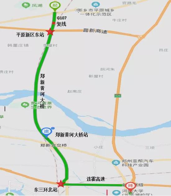 分流點設在鄭新黃河大橋收費站,分流路線為G107復線——鄭新黃河大橋——鄭新黃河大橋站——G107輔道——東三環北站——連霍高速開封方向——連霍高速——京港澳高速武漢方向——京港澳高速。