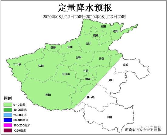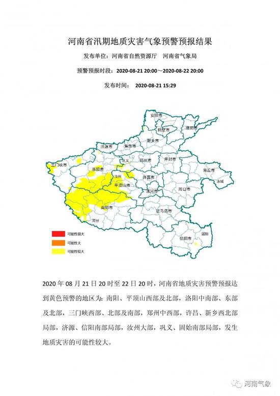 2020年08月21日20時至22日20時,河南省地質災害預警預報達到黃色預警的地區為:南陽、平頂山西部及北部,洛陽中南部、東部及北部,三門峽西部、北部及南部,鄭州中西部,許昌、新鄉西北部局部,濟源、信陽南部局部,汝州大部,鞏義、固始南部局部,發生地質災害的可能性較大。