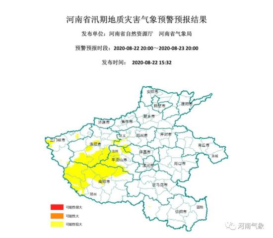 2020年08月22日20時至23日20時,河南省地質災害預警預報達到黃色預警的地區為:南陽、平頂山西部及北部,洛陽中南部及東部,三門峽周邊,鄭州西南部,許昌西北部,信陽西部局部,汝州大部,鞏義南部,發生地質災害的可能性較大。
