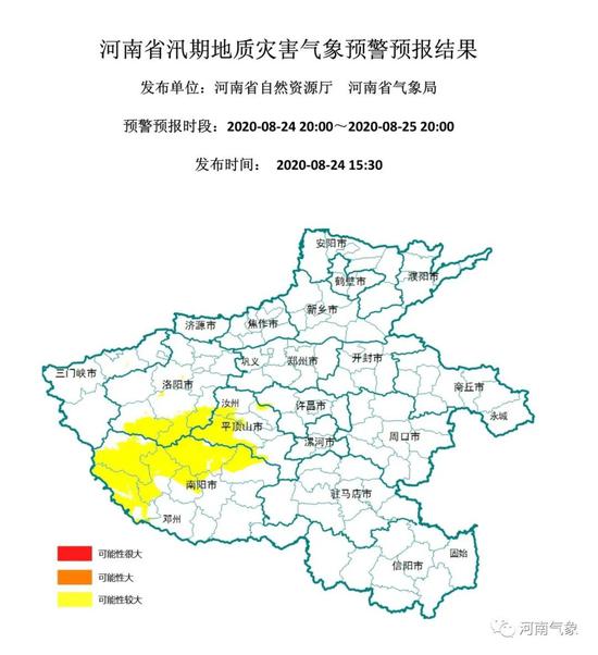 2020年08月24日20時(shí)至25日20時(shí),河南省地質(zhì)災(zāi)害預(yù)警預(yù)報(bào)達(dá)到黃色預(yù)警的地區(qū)為:南陽、平頂山西部及北部,洛陽中部及南部,三門峽東北部局部,許昌西北部局部,汝州西南部,發(fā)生地質(zhì)災(zāi)害的可能性較大。