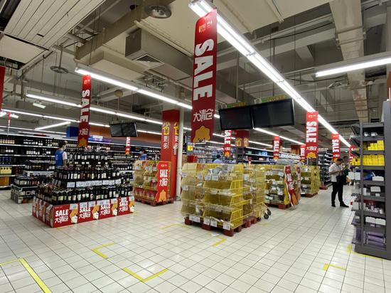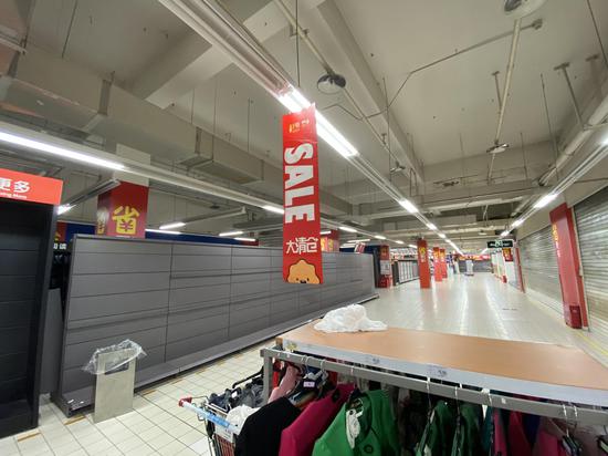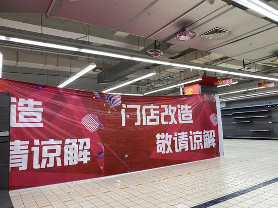 超市內,赫然醒目的“大清倉”“SALE”等字樣條幅掛滿一樓大廳,同時,門店貨架還印有“門店改造,敬請諒解”的字樣。