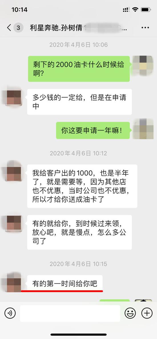 但是沒(méi)想到就是這說(shuō)好的三千塊錢(qián)油卡,到今年的3月20日,只給了一千元,剩余的兩千元竟然拖了快一年,只要一給銷(xiāo)售顧問(wèn)孫女士打電話(huà),孫女士就推脫,“哎呀我有點(diǎn)忙,你等一下吧。”