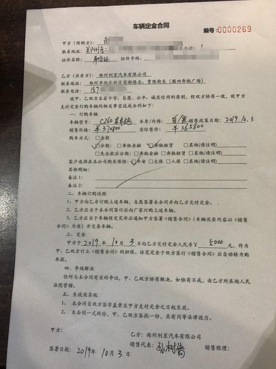 8月31日,趙先生向河南交通廣播《汽車(chē)幫幫團(tuán)》節(jié)目組投訴,自己于2019年10月份在鄭州利星4S店買(mǎi)了一輛奔馳C260,銷(xiāo)售顧問(wèn)說(shuō)分期購(gòu)買(mǎi)的話(huà),優(yōu)惠五千元,但是趙先生一算,分期不劃算,就直接付了全款,銷(xiāo)售顧問(wèn)稱(chēng),之前答應(yīng)的優(yōu)惠五千元是分期購(gòu)買(mǎi)才有的活動(dòng),如果全款就只能給三千塊錢(qián)油卡,趙先生表示同意。