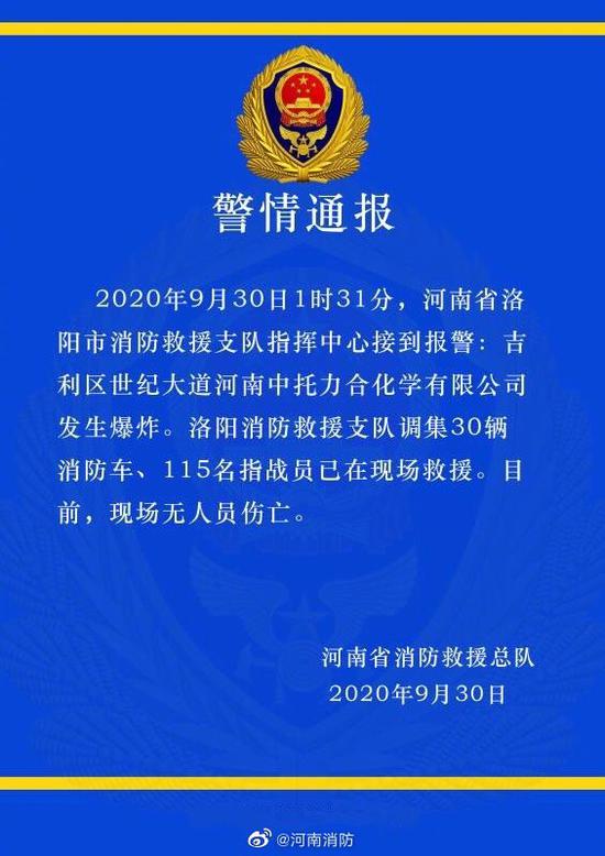 據(jù)河南省消防救援總隊官方微博9月30日消息,30日1時31分,河南省洛陽市消防救援支隊指揮中心接到報警:吉利區(qū)世紀大道河南中托力合化學有限公司發(fā)生爆炸。洛陽消防救援支隊調(diào)集30輛消防車、115名指戰(zhàn)員已在現(xiàn)場救援。目前,現(xiàn)場無人員傷亡。