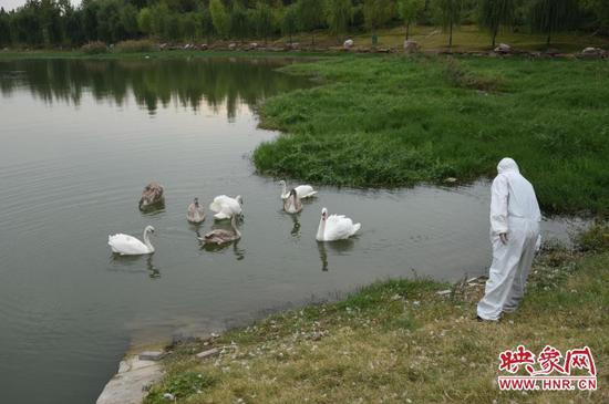 鄭州市林業(yè)局野生動物救護(hù)站董朝偉站長隨后對現(xiàn)場噴灑消毒,又將岸邊的塑料袋等垃圾拾起,以防止被疣鼻天鵝誤食。