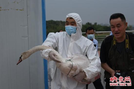 9月29日下午16時許,鄭州市林業(yè)局野生動物救護(hù)站工作人員將傷愈的疣鼻小天鵝從救護(hù)籠舍里抱出。為了防止其在車上掙扎時誤傷,工作人員用編織袋將其的身體進(jìn)行了包裹,但溫馴的它并沒有做出任何攻擊行為。