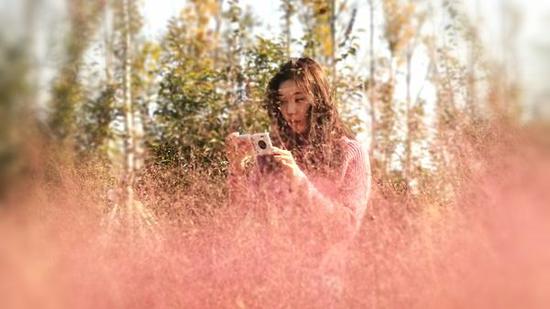 公園內盛開的粉黛亂子草吸引游客駐足拍照