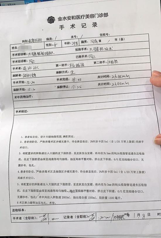 10月26日,小夢向大象新聞·東方今報記者講述經(jīng)歷:2020年1月8日,她花費(fèi)2萬元在鄭州市安和醫(yī)療美容門診有限公司(下稱“安和整形”)做了大腿抽脂手術(shù),3月份左腿局部開始出現(xiàn)積液,后來鼓起乒乓球大的包,4月26日返回安和整形治療24天不見好轉(zhuǎn)。