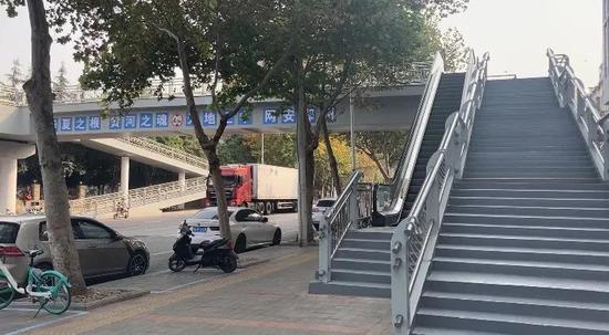 就在路口10米遠的地方,就有一座過街天橋。但是,記者在現場觀察了大約30分鐘,并沒有行人或者是學生從上面通行,而天橋的自動扶梯還是運作的,不過已然成了擺設。