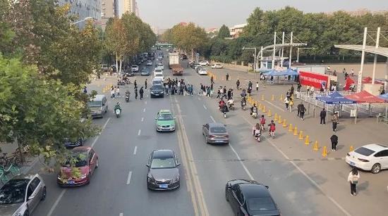 10月29日上午,記者在鄭州師范學院南門處看到,在上課下課的高峰時段,有成群結隊的學生從馬路中間橫穿而過,路過的車輛走走停停不斷避讓,在短短的二十分鐘里,就有大量的學生和行人橫穿馬路,十分危險。