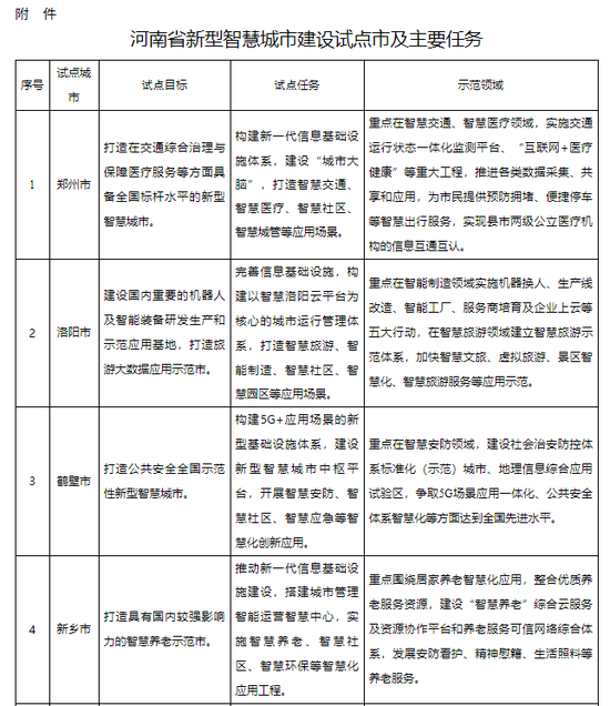 附件:河南省新型智慧城市建設(shè)試點市及主要任務(wù)