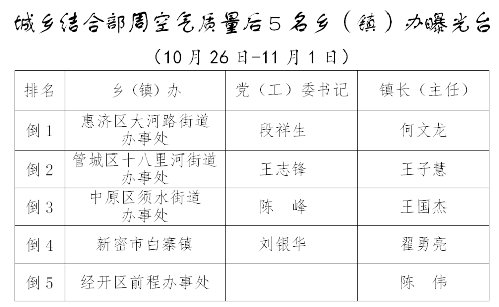 根據(jù)《關(guān)于實施秋冬季空氣質(zhì)量排名公示曝光的通知》要求,市攻堅辦對鄭州市各開發(fā)區(qū)、區(qū)縣(市)及36個城鄉(xiāng)結(jié)合部鄉(xiāng)(鎮(zhèn))辦10月26日至11月1日空氣質(zhì)量排名如下: