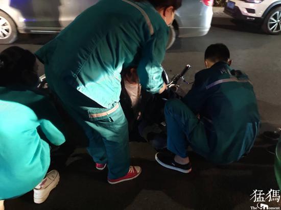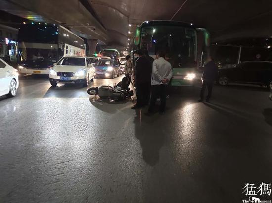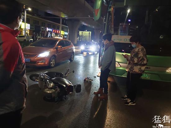 下午七點左右,在上述路段正對隴海路一處開口處斑馬線東邊看到,一名被撞傷的騎電動車女子坐在地上無法起身,旁邊一輛公交車右前方大燈下有一個碗口大的深坑。
