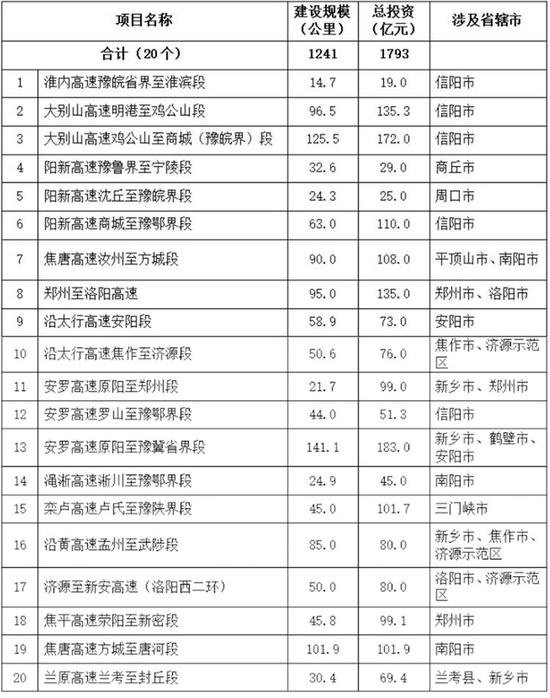一、2020年通車項目(3個):鄭西高速堯山至欒川段、濟洛高速濟源至洛陽西、臺輝高速豫魯省界至臺前段