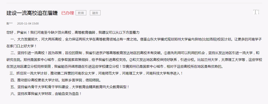 對此,河南省教育廳11月6日回復稱,“非常感謝您的建議,您從內部提升和外部帶動兩方面對河南高等教育發展提出了很好的建議,近年來省政府也一直從做優存量、做好增量兩方面提升高等教育質量。我們在‘十四五’期間將充分吸納您的建議,做好高等學校設置和發展規劃。”