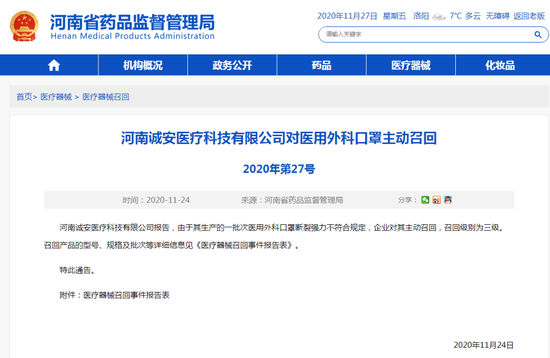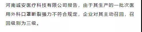 3。河南誠(chéng)安醫(yī)療科技有限公司對(duì)醫(yī)用外科口罩主動(dòng)召回