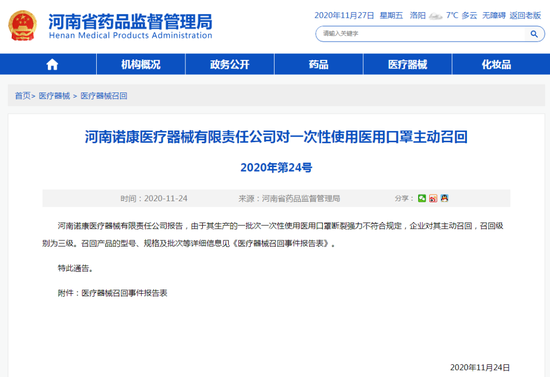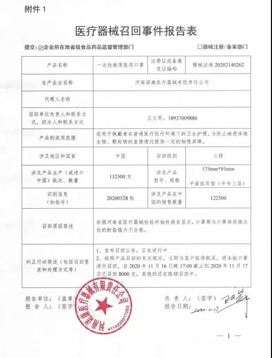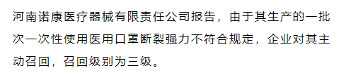 1。河南諾康醫(yī)療器械有限責(zé)任公司對(duì)一次性使用醫(yī)用口罩主動(dòng)召回