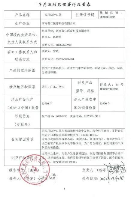4。河南善仁醫(yī)療科技有限公司對(duì)醫(yī)用防護(hù)口罩主動(dòng)召回