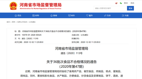 原標題:《河南省市場監督管理局關于36批次食品不合格情況的通告(2020年第47期)》