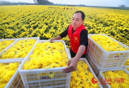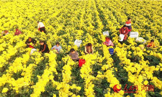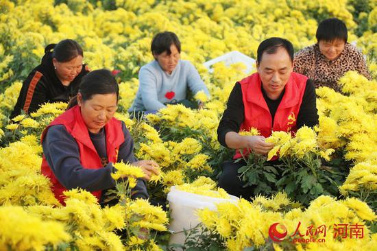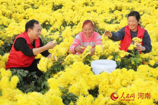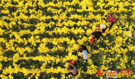 人民開封12月12日電 (霍亞平)近日,河南尉氏縣張市鎮石潭村同和種植專業合作社內,金黃的菊花競相綻放,黨員志愿者與村民一起,麻利地采摘菊花。幾天后,這些經過烘干的菊花將發給江西、安徽的收購商。