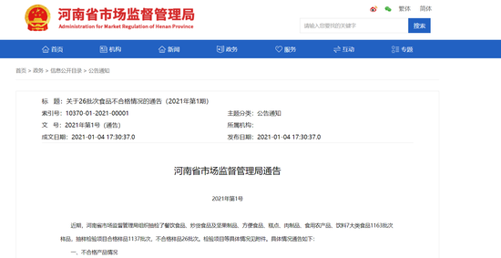 原標題:《關于26批次食品不合格情況的通告(2021年第1期)》