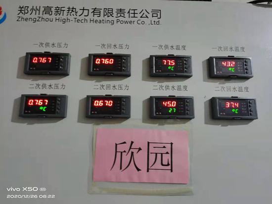 隨后記者來到了該小區物業(鄭州潤田物業公司)了解情況,物業公司秦經理介紹,該小區屬于河南工業大學師生周轉房,是由物業和學校一起管理的。目前小區暖氣不熱的情況屬于熱力公司給的熱源不夠,同時秦經理提供了12月26日至29日拍攝的熱交換站數據,其中12月26日上午8點22分,顯示一次供水壓力767,一次回水壓力760,一次供水溫度77.5℃,一次回水溫度43.2℃,其余幾日的數據與26日數據接近,29日各項數據有所回升。“今年地暖確實整體比去年低,去年一次供水溫度能達到90~100℃,今年才70多攝氏度,那肯定熱不了啊。”秦經理說。