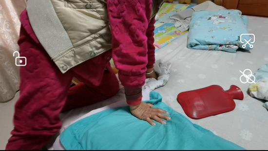 同在一號樓的陳女士家溫度則明顯較低,3點57分,溫度測量儀顯示僅為16.4℃。陳女士向記者展示其侄女晚上睡覺要抱著熱水袋,每天晚上都喊著“冷冷冷”,不抱熱水袋睡不著覺。