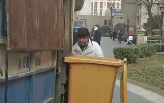 視頻中,一名中年男子站在垃圾車上收拾著,而垃圾車下則有一名身穿白色羽絨服的女孩兒在幫忙操作著垃圾車將垃圾運到車上,然后再將垃圾桶放回原處。