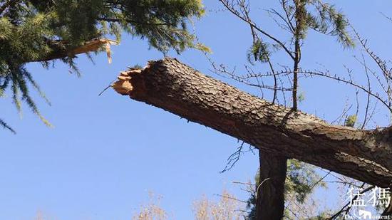1月28日,大風(fēng)突襲鄭州,上午11時(shí)許,位于鄭州高新區(qū)瑞達(dá)路上的一棵樹干直徑30多厘米的雪松,從4米多高的樹干中段突然折斷,剛好砸中從樹下經(jīng)過的兩輛轎車,其中一人受傷后被送往醫(yī)院。