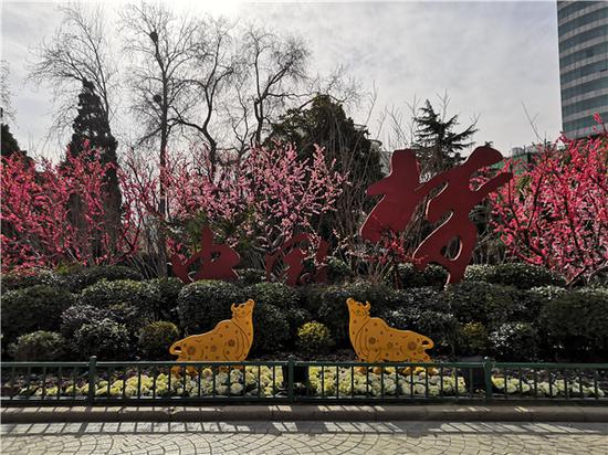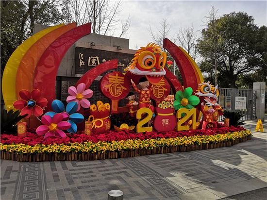 同時,為營造節日氛圍全園懸掛燈籠80余個,制作大型景點5處,包括以“孺子牛”“拓荒牛”“老黃牛”為元素,寓意“發揚三牛精神,奮進新時代”的“犇騰”景點;祝福先祝牛年好,牛轉乾坤夢成真的“紅梅鬧春”景點;以姹紫嫣紅的花樹為背景,大紅色“中國夢”和金牛為主題,展示中華民族偉大復興的中國夢越來越近的“三牛逐夢”景點;仙鶴展翅牛年到,家國祥和萬事好的“鶴迎牛年”景點;訴說歲月靜好,山河無恙的“湖邊梅”景點。