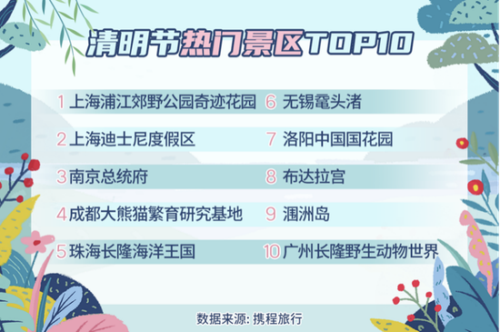出游主題方面,花園花海、動植物園、城市公園、主題樂園、水族館、博物館、古鎮是清明節最熱門的幾大景區類型。數據顯示,上海浦江郊野公園奇跡花園、上海迪士尼度假區、南京總統府、 洛陽中國國花園 、成都大熊貓繁育研究基地等位列“清明節熱門景區前十位”。