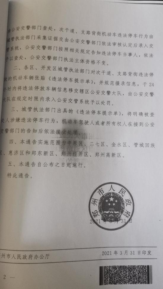 據悉,目前鄭州市已發布《關于加強市區道路機動車停放執法管理的通告》(以下簡稱《通告》),《通告》顯示,為進一步加強鄭州市城區道路交通秩序綜合治理,提高執法效率,形成執法合力,鄭州市決定將城管執法部門采集的市區次干道、支路背街機動車違法停車信息交公安交警部門依法審核認定后錄入交管系統處理。